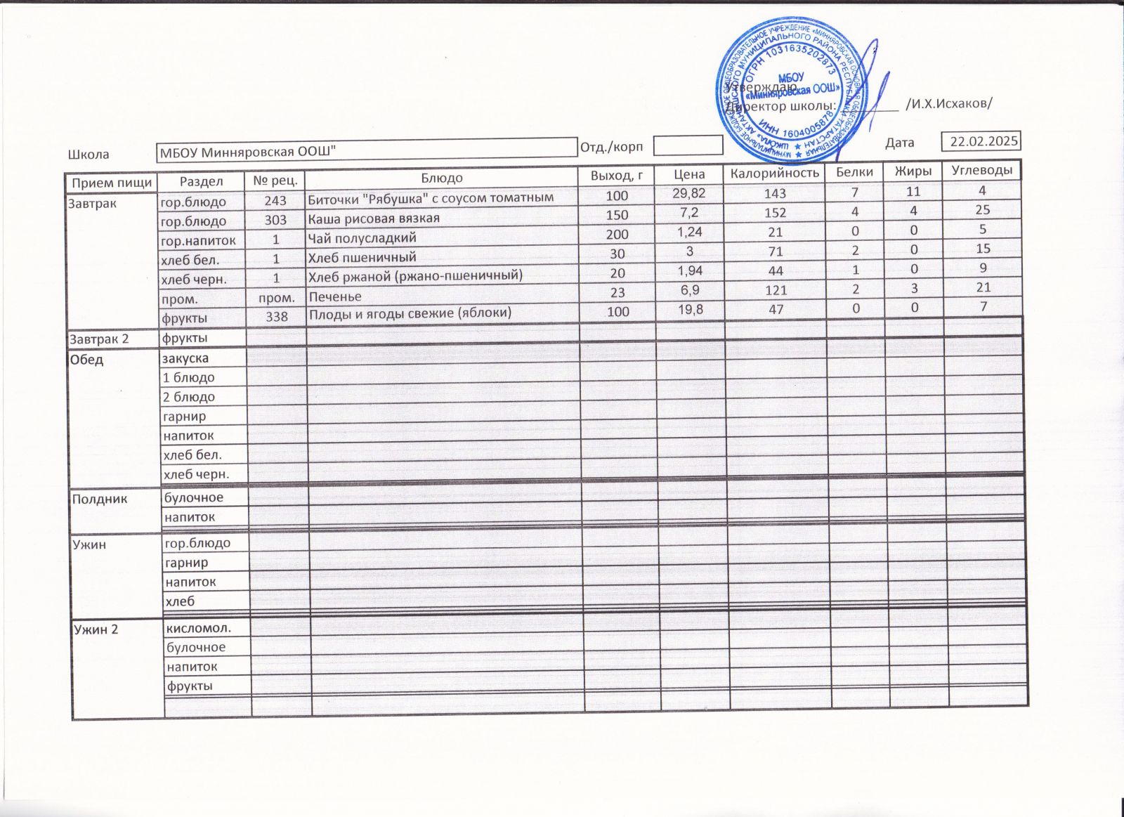 Меню МБОУ "Минняровская ООШ" на 22.02.2021, на 24.02.2021, на 25.02.2021, на 26.02.2021, на 27.02.2021г.