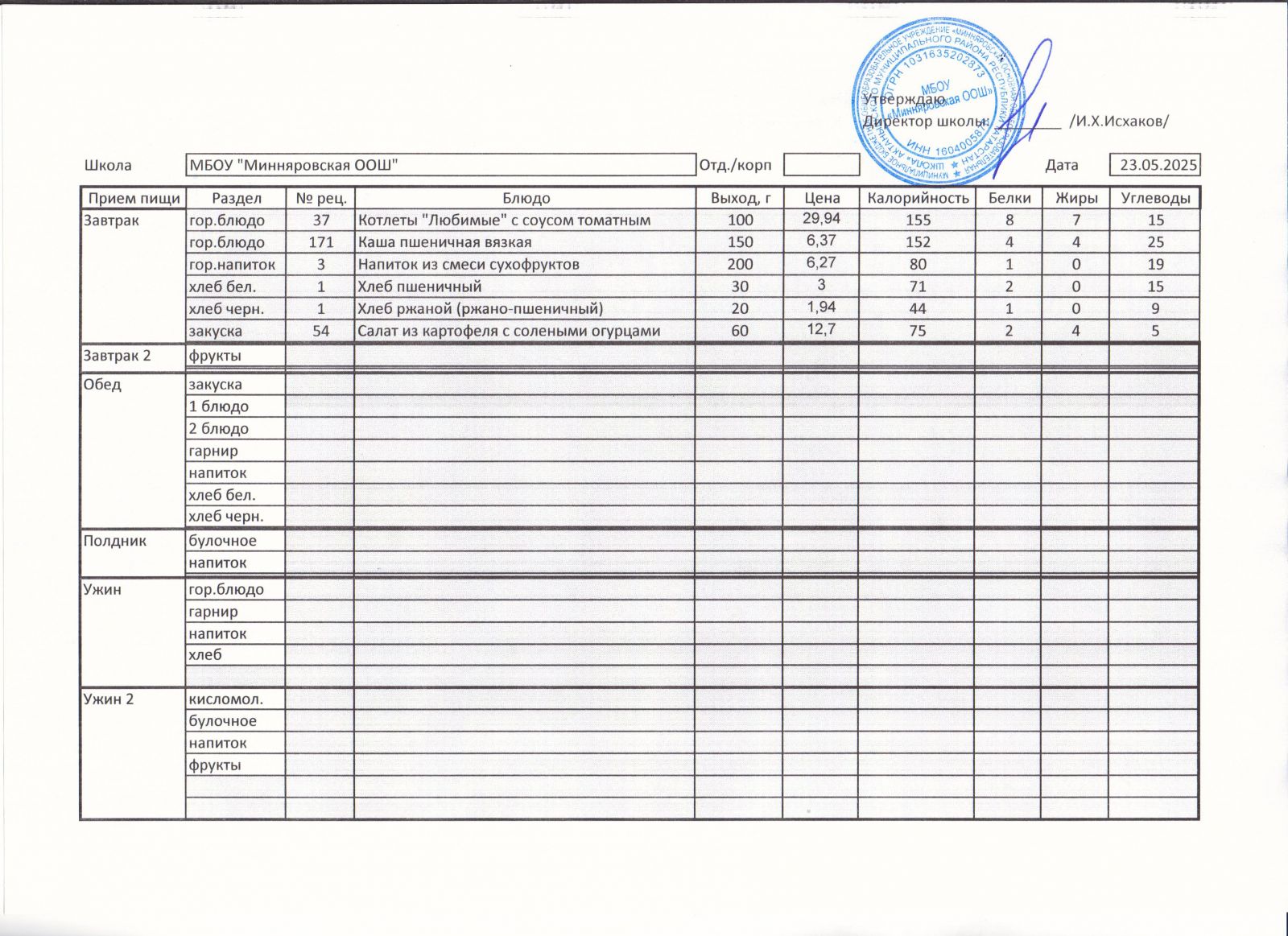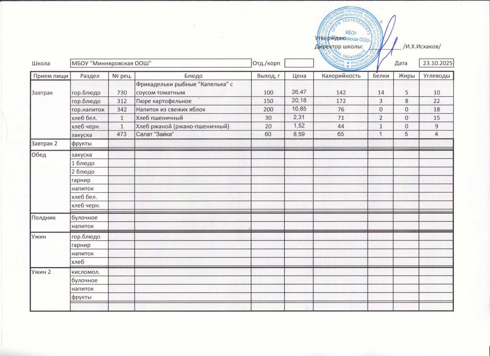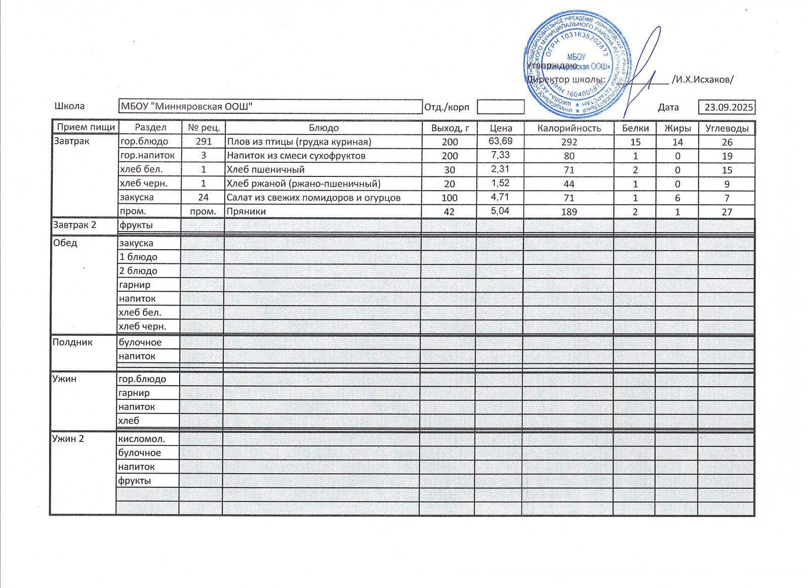 Меню МБОУ "Минняяровская ООШ" на 23.11.2020г.