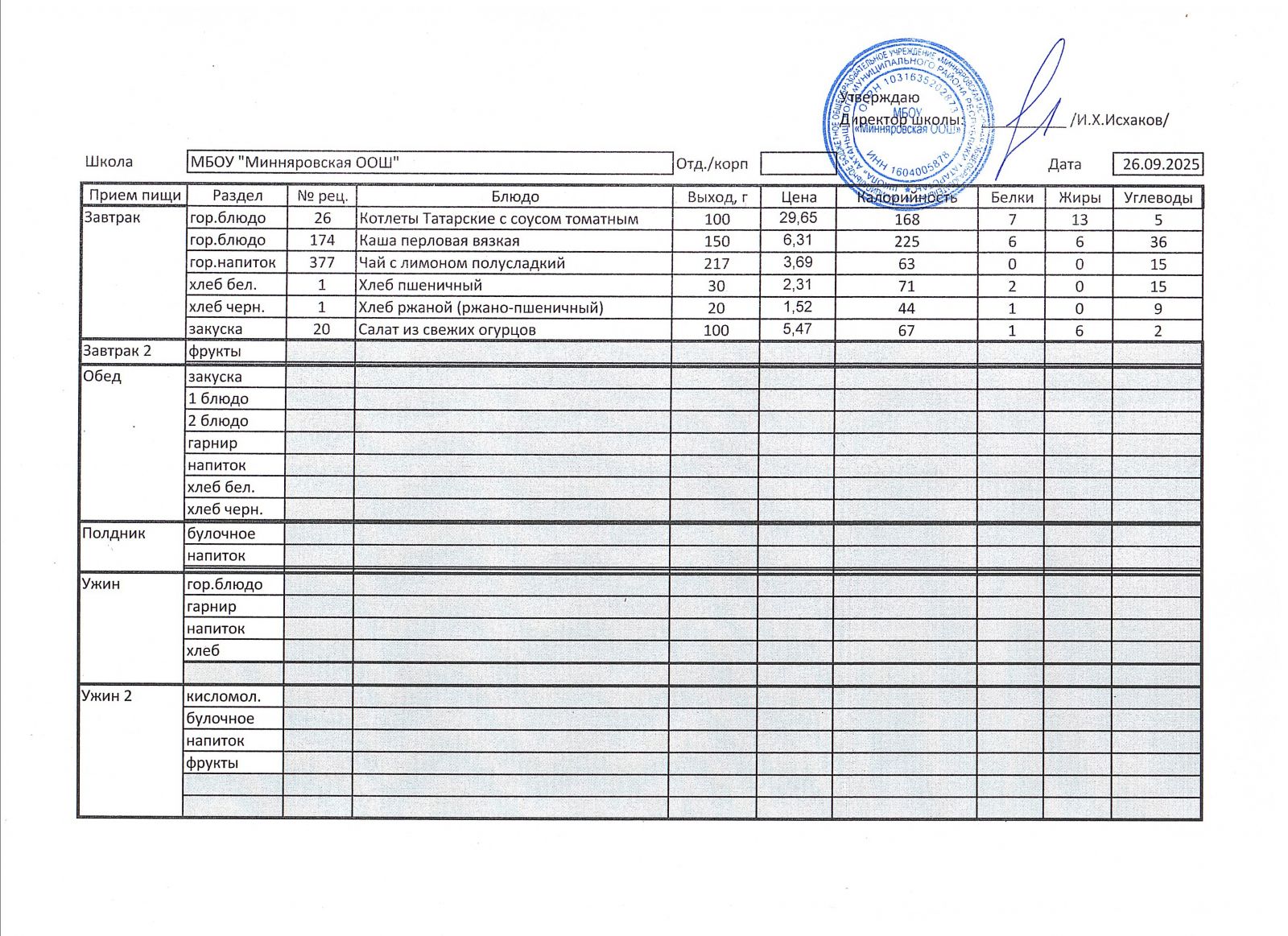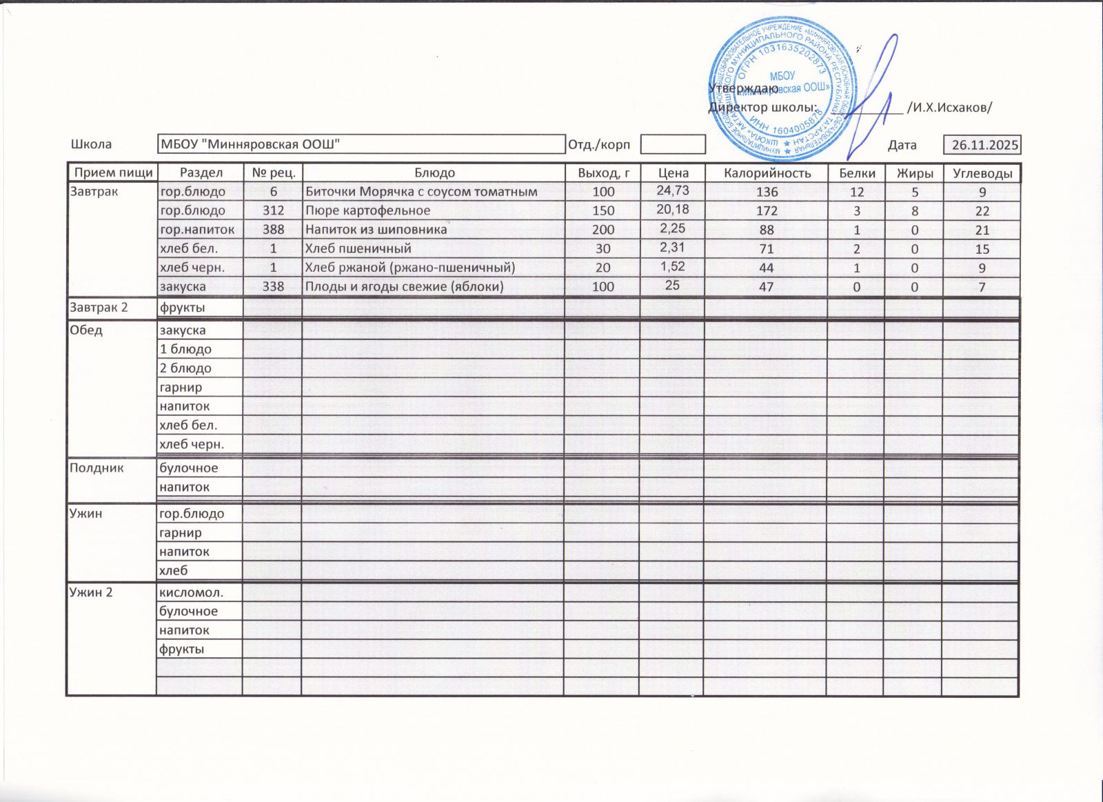 Меню МБОУ "Минняровская ООШ" на 26.11.2020г.