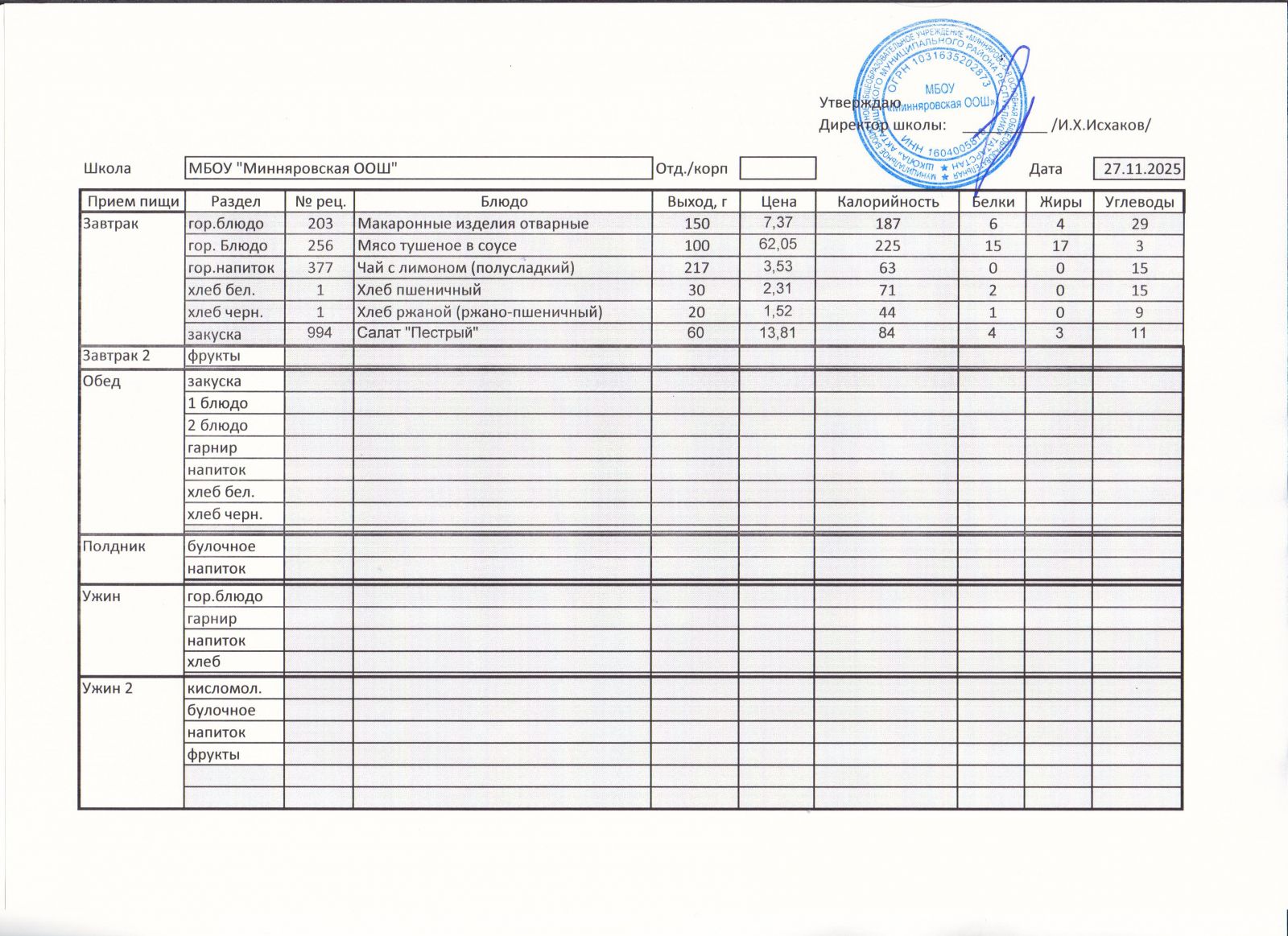 Меню МБОУ "Минняровская ООШ" на 27.11.2020г