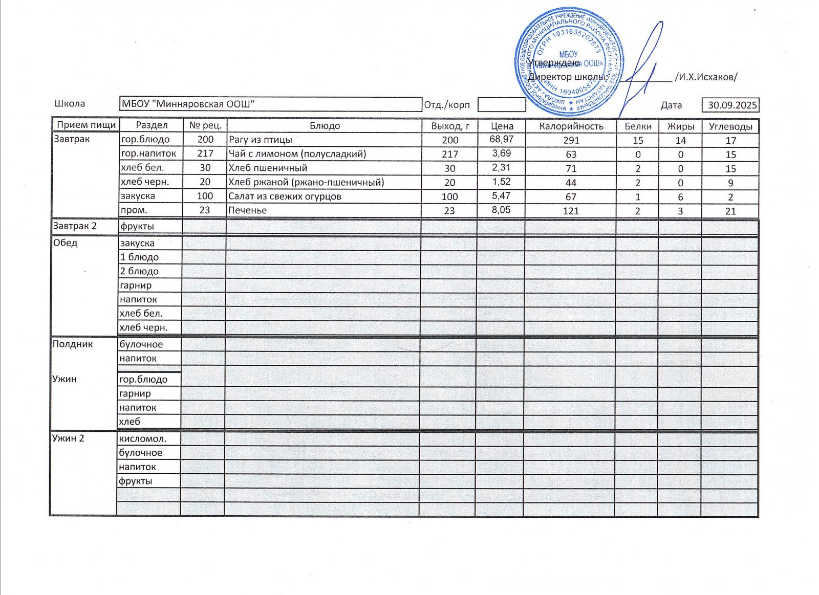 Меню МБОУ "Минняровская ООШ" на 30.11.2020