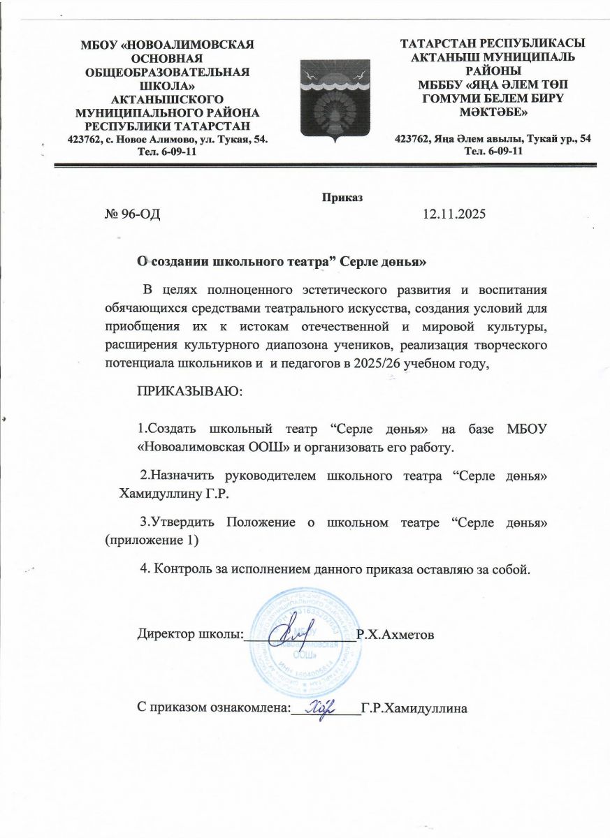 Муниципальное бюджетное общеобразовательное учреждение «Новоалимовская основная общеобразовательная школа» Актанышского муниципального района Республики Татарстан / Татарстан Республикасы Актаныш муниципаль районы "Яңа Әлем төп гомуми белем бирү мәктәбе" муниципаль бюджет гомуми белем бирү учреждениесе