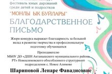 Жюри конкурса выражает БЛАГОДАРНОСТЬ за большой вклад в развитие творчества и профессиональную подготовку обучающихся преподавателю МБОУ ДО «ДШИ Актанышского муниципального района РТ» с. Новое Алимово ШАРИПОВОЙ ЛЕНАРЕ ФАВАДИСОВНЕ .Лауреат II степени-хореографический коллектив «БӘХЕТЛЕ БАЛАЧАК»,