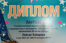 Особенно хочется отметить достижения наших лауреатов и дипломантов:Диплом Лауреата I степени получила ХАБИРОВА ЛЕЙСАН, под руководством преподавателя Загитовой Ильсии Индусовны.