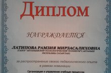 Преподаватель физики Латыпова Рамзия Мирзасалиховна получила диплом за распространение своего педагогического опыта в рамках номинации "Организация и управление учебным процессом"
