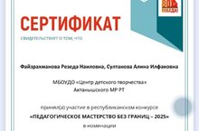 Балалар иҗат үзәге җитәкчесе Фәйзрахманова Резеда Наил кызы һәм өстәмә белем бирү педагогы Солтанова Алинә Илфак кызы «Педагогическое мастерство без границ - 2025» республика конкурсында «Мәгариф оешмасында остазлык системасы белән идарә итү - уңайлы белем бирү мохитен формалаштыру нигезе» номинациясендә катнаштылар.