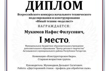 По итогам Всероссийского конкурса по начальному техническому моделированию и конструированию "Юный техник - моделист", воспитанник кружка "Умелые руки" Мукимов Нафис занял первое место в номинации "Конструкторское бюро"в старшей возрастной группе.Руководитель - педагог ДО Мухамадиев Д.С. Поздравляем!