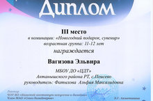 "Кыш бабайга котлау" ачык республика декоратив гамәли сәнгать бәйге - күргәзмәсендә Балалар иҗат үзәгенең "Графика һәм дизайн нигезләре" түгәрәгендә шөгыльләнүче Вагизова Эльвира мактаулы III урынны яулады.Остазы - Фатихова Әлфия Максалидовна. Котлыйбыз,яңа иҗади уңышлар телибез!