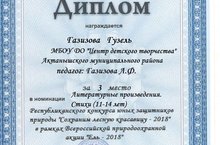Ученица кружка "Выразительное слово" Газизова Гузель заняла 3 место в республиканском конкурсе юных защитников природы "Сохраним лесную красавицу - 2018".Педагог - Газизова Л.Ф.