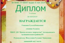 награждена дипломом 1 степени в номинации в Республиканском открытом конкурсе творчества "Тукай в наших сердцах" в номинации "Декоративно - прикладное творчество (поделки)" Руководитель Фазуллина Гульшат