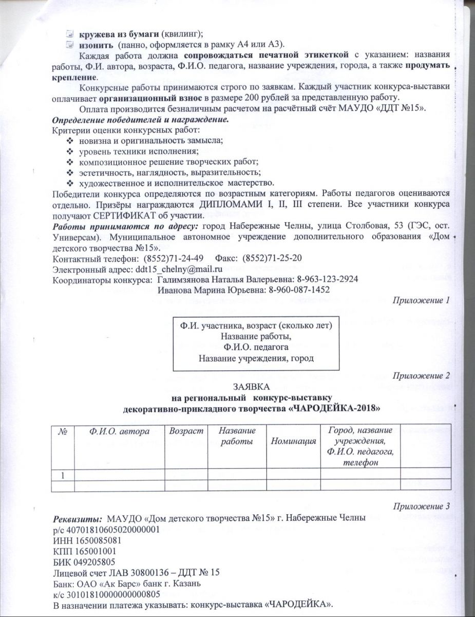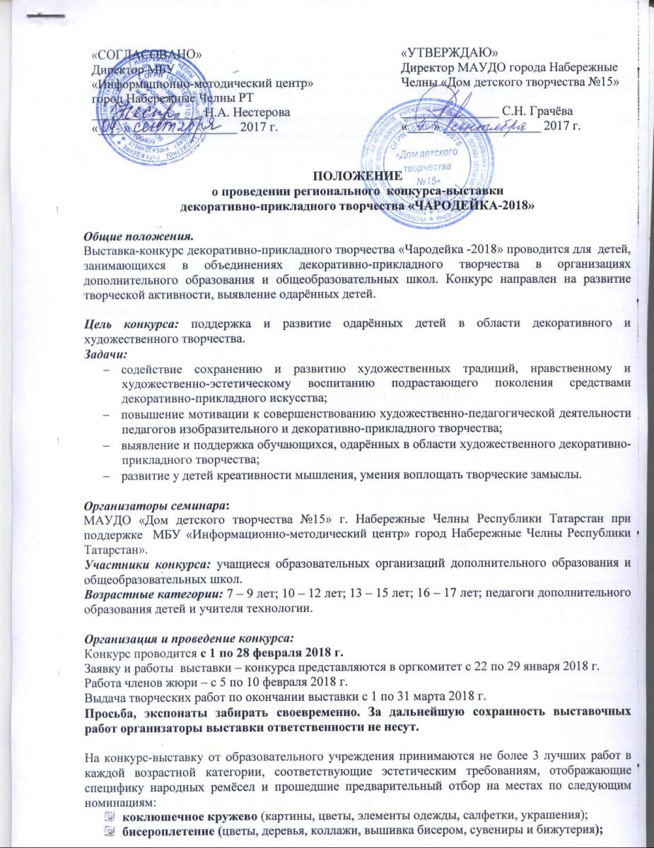 Опубликовано: 19.01.2018Выставка-конкурс декоративно-прикладного творчества "Чародейка-2018"проводится для детей занимающихся в объединениях декоративно-прикладного творчества в организациях дополнительного образования и общеобразовательных школ.Конкурс направлен на развитие творческой активности,выявление одаренных детей