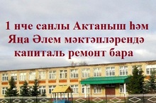 Республикада гомумбелем бирү учреждениеләрен капиталь ремонтлау программасы эшли башлады. Әлеге программага безнең районнан да Актаныш урта гомумбелем бирү мәктәбе һәм Яңа Әлем гомумбелем бирү мәктәбе кертелгән. Башка төбәкләрдә, нигездә, капиталь ремонтка май айларында гына керешү планлаштырылса, бездә инде бу нисбәттән күптән эш бара. Язгы яңгырлар башланганчы, дип, иң элек мәктәпләрнең түбәләрен яңартып ябу эшенә тотындылар. Актанышта бу эш белән «Газстройсервис» ҖЧҖ, Яңа Әлемдә исә “ТеплоЛюкс Плюс” ҖЧҖ шөгыльләнә.