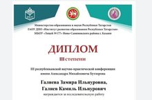 А.М.Бутлеров исемендәге III Республика фәнни-практик конференциясендә өченче урынны алган 4 нче А сыйныф укучысы Зәмира Галиеваны котлыйбыз! Җитәкчесе: Галиева Зилә Әхәт кызы.Афәрин!