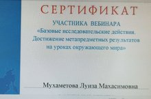Сегодня учитель Тыннамасовской начальной школы Л.М. Мухаметова приняла участие в вебинаре на тему «Базовые исследовательские действия.Достижение метапредметных результатов на уроках окружающего мира».