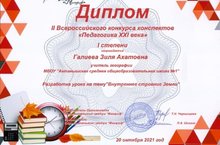 География укытучысы Галиева Зилә Әхәт кызы "Мәгариф" белем бирү үзәге тарафыннан оештырылган "XXI гасыр педагогикасы" II Бөтенроссия дәрес эшкәртмәләре конкурсында "Җирнең эчке төзелеше" дәрес эшкәртмәсе өчен 1 дәрәҗә диплом белән бүләкләнде.