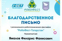 Учащиеся 3А класса Ямалов Азамат и Фахразиев Раяз (руководитель - Ямалов Филарис Фанисович) успешно приняли участие в I робототехническом фестивале "РоботоФест-Татарстан", который состоялся 22 декабря в городе Набережные Челны. Ребята награждены сертификатами участников, их руководитель - благодарственным письмом. Поздравляем! Молодцы!