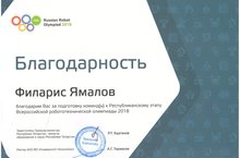 24 апреля на базе ДНРЦ "Зарница" состоялся Республиканский этап Всероссийской Робототехнической Олимпиады 2018 для категорий начинающие. Учащиеся нашей школы Фатхебаянов Артур (7 класс) и Курбанов Ахат (6 класс) награждены сертификатами участников. Руководитель ребят Ямалов Филарис Фанисович награжден благодарственным письмом. Молодцы!