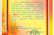 "Өй алдыбыз гөлбакча - 2017" район бәйгесендә район үзәге оешмалары һәм белем бирү учреждениеләре арасында мәктәбебез коллективы беренчелекне яулады. Котлыйбыз! Киләчәктә дә уңышлар телибез!