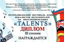 В Набережных Челнах сотоялся Республиканский фестиваль-конкурс вокалистов-исполнителей на иностранном языке "Talents". Учащиеся нашей школы ежегодно принимают участие в данном конкурсе и оказываются в числе лучших. Зиннурова Лилия и Габдуллина Энзе награждены дипломами III степени в номинации "Вокал-соло" (педагоги - Гимадиева Миляуша Ильдусовна и Камалетдинова Роза Тимеряновна), Басырова Чулпан стала обладателем свидетельства участника (педагог - Ахметова Гульнара Ингеловна). Молодцы! Поздравляем!