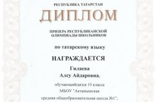 Ученица 10бласса Гилаева Айгуль (руководитель - Рахманова Гульнара Фалгатовна) стала призером Республиканской олимпиады школьников по татарскому языку. Молодец! Поздравляем!