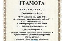 Галимянов Айдар награжден грамотой за участие в конкурсе детского изобразительного искусства и художественно-прикладного творчества "Мечты детства" в номинации "Юные мастера и подмастерья", проведенного в рамках республиканского этапа XVII Международного фестиваля "Детство без границ". Поздравляем!