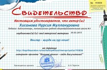 8 нче март Әниләр көне уңаеннан китапханәче Хисамова Нурсия Муллануровна интернет-проект "Копилка уроков - сайт для учителей" проектында "Әниләр - җирдә иң зур кеше" сценарие белән катнашып, сертификатка ия булды.