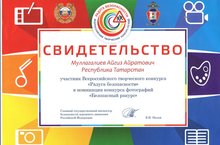 Учащиеся нашей школы приняли участие во Всероссийском конкурсе "Радуга безопасности" (руководители - Ахметханова Илиза Хиразетдиновна, Хабибуллина Зухра Баязитовна). Муллагалиев Айгиз награжден сертификатами 2-х номинаций - "Безопасный ракурс" и "Правила дорожного движения знай! Смотри и запоминай", Шарипов Булат - в номинации "Правила дорожного движения знай! Смотри и запоминай". Молодцы! Поздравляем!