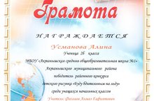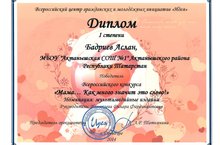 Состоялся Всероссийский конкурс "Мама... Как много значит это слово!", проведенный по инициативе Всероссийского центра гражданских и молодежных инициатив "Идея". В нем приняли участие очень много наших учащихся. Валиев Фидан, Лепихина Камиля, Фаррахова Алина, Шакуров Ильгиз (руководитель - Масалимова Сария Фирдависовна), Бадриев Аслан, Яхшыгулова Зайнап (руководитель - Исмакаева Дилара Фирдинатовна) награждены дипломами, Шайхразиева Эльза (руководитель - Исмакаева Дилара Фирдинантовна), Исламова Чулпан (руководитель - Масалимова Сария Фирдависовна) - сертификатами участников. Поздравляем!