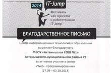 С 27 сентября по 3 октября учащиеся 10 класса Багаутдинов Алмаз, Гарипов Айгиз, Гарифуллин Рамиль, Мирзамухаметов Ильяс приняли участие в смене «Web-программирование» в рамках совместного с IT-парком г.Казани республиканского проекта IT-Jump (учитель информатики Ялалова Гульнара Дильшатовна). Ребята награждены сертификатами и благодарственными письмами. Молодцы! Поздравляем!