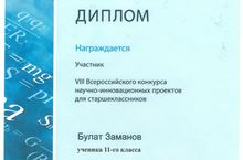 Поздравляем учащегося 11 класса Заманова Булата - обладателя диплома участника VIII Всероссийского конкурса научно-инновационных проектов для старшеклассников (научный руководитель - Мухамадиев Дильшат Сагитович). Молодец, Булат!