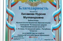Благодарность объявлена библиотекарю школы Хисамовой Нурсие Муллануровне за активное участие в работе социальной сети работников образования. Спасибо за Ваш труд, Нурсия Муллануровна!