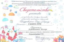 Сертификатом участника Республиканского конкурса -выставки декоративно-прикладного творческтва "Поздравление Деду Морозу" в номинации "Символ года" награждена Ахметдинова Ильзира (педагог - Ахметдинова Гульнара Гранитовна). Так держать, Ильзира!