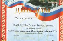 Поздравляем учителя математики Маликову Резеду Тимергазиевну со вторым местом в Интеллектуальной викторине "Опять 25!", проводимой Московской Ассоциацией предпринимателей и Оргкомитетом Международного Слёта учителей. Желаем дальнейших профессиональных побед и успехов!