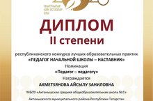 В республиканском конкурсе "Педагог начальной школы - наставник" учитель начальных классов нашей школы Ахметзяновой Айсылу Заниловна награждена дипломом II степени в номинации «Учитель-учителю». Поздравляем!