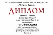 На III Республиканском конкурсе детского творчества "Читаем Тукая", который проводился в Мамадышском районе, обучающиеся нашей школы приняли активное участие. По итогам участия Латыйпов Азамат, ученик 3Б класса стала Лауреатом I степени в номинации "Рисунок" среди учащихся 7-12 лет. Руководителем Азамата является Камалова И.С., учитель начальных классов. В этой же номинации Султанова Алия, ученица 4Б класса, стала Лауреатом III степени, ее руководитель - учительница начальных классов Нуриева Л.М.