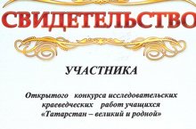 Ученик 6Б класса Латыпов Мансур был участником и получил свидетельство в номинации "Экологическое краеведение" Открытого конкурса исследовательских краеведческих работ учащихся "Татарстан - великий и родной" (учитель Латыпова Л.Р.).