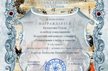 Ученица 9 А класса Белоусова Гузель награждена Дипломом II степени за победу во Всероссийском конкурсе сочинений "Размышления о чести и совести" (уч. Белоусова М.И.). Поздравляем!!!