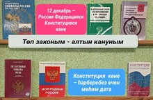 12 декабрьдә Россия Федерациясенең күпмилләтле халкы илебезнең тарихында иң мөһим дәүләт бәйрәмнәрнең берсе - Конституция көнен билгеләп үтә. Конституция - төп закон ул. Анда дәүләтнең иҗтимагый, икътисади корылыш нигезләре, гражданнарның хокуклары һәм бурычлары билгеләнгән. Шул уңайдан китапханә дә " Төп законым - алтын кануным " дип исемләнгән китап күргәзмәсе эшли.