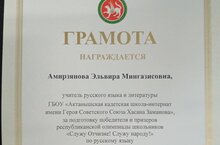 Кадет 8 класса нашей школы Хайруллин Марат(руководители Мокимов Р.Р., Гардиева Л.Ф.)занял 3 место в номинации "Конкурс видеороликов Я помню - я горжусь!". Классный руководитель 7 класса Залалова Г.Г. заняла 3 место в номинации "Конкурс для классных руководителей".