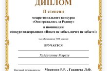 Ученик 7 класса нашей школы Хайруллин Марат(руководители Мокимов Р.Р., Гардиева Л.Ф.) занял II место в межрегиональном конкурсе "Они сражались за Родину" видеороликов "Никто не забыт, ничто не забыто!", награждён Дипломом II степени.