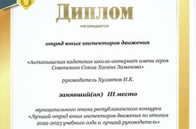 Отряд юных инспекторов движения ГБОУ "Актанышская КШИ" (руководитель Хуззятов Н.К.) занял III место муниципального этапа республиканского конкурса "Лучший отряд юных инспекторов движения по итогам 2022-2023 учебного года и лучший руководитель", награждён Дипломом.