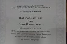 Ученик 9б класса нашей школы Баев Вадим(учитель Авзалов Радислав Алексович) стал призёров регионального этапа Всероссийской олимпиады по обществознанию. Поздравляем!