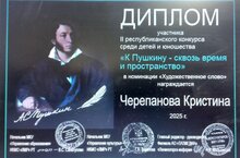 Ученица 7б класса нашей школы Черепанова Кристина(руководитель Залалова Г.Г.) награждена Дипломом II республиканского конкурса среди детей и юношества "К Пушкину - сквозь время и пространство" в номинации "Художественное слово". Поздравляем!