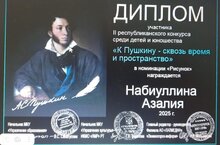 Ученица 10 класса нашей школы Набиуллина Азалия(руководитель Валиева Г.Ф.) награждена Дипломом II республиканского конкурса среди детей и юношества "К Пушкину - сквозь время и пространство" в номинации "Художественное слово". Поздравляем!