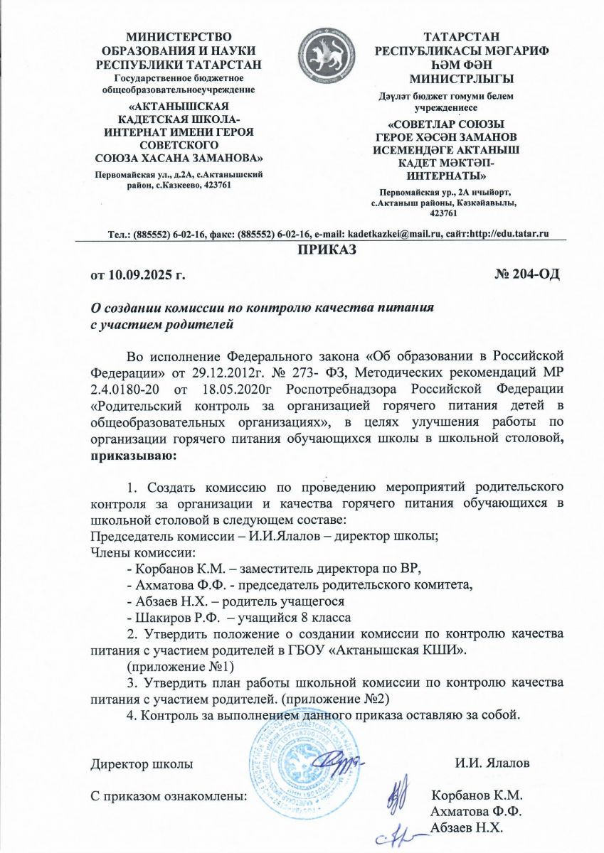 Приказ о создании бракеражной комиссии на 2025-2026 учебный год