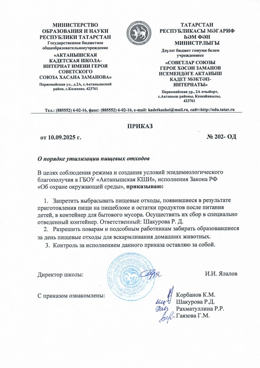Приказ № 204-ОД от 01.09.2025 О порядке утилизации пищевых отходов