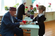 Мәктәбебез бүген гөрләп тора. Ник дисезме? Бездә бүген зур бәйрәм – кунаклар килде. Авылыбызның зур хөрмәткә лаек кешеләре – Бөек Ватан сугышы ветераны Шакиров Вазыйх абый һәм тыл ветераны Өммехани апа Баянова белән очрашу үткәрдек. Бәйрәм укучыларның чыгышы белән үрелеп барды. Ветераннарыбыз сугышның рәхимсезлеге турында ачынып сөйләделәр. Вазыйх абый үзенең сугыш чорында нинди өлкәләрдә булуын, сугыш тәмамлангач, ничек шатланып туган авылына кайтуын азсызыклады. Өммаһани апа үзенең чыгышында балаларны чкты матур дөньяда яшәүнең кадерен белергә, дус тату булып яшәргә чакырды. Үзенең чыгышын Гәүһәр Шиһапованың “Еракта калган язмышлар”шигыре белән тәмамлады.