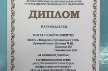 Татар Суыксуы мәктәбенең театр коллективы "Юные герои Великой Победы" конкурсында актив катнашучы дипломы белән бүләкләнде. Җитәкчеләре Галиева Ч.Ш., Гилазова Р.Р., Гильманова Р.М. Зур рәхмәтебезне белдерәбез!