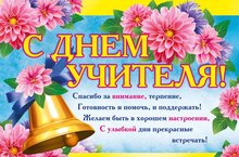 С днем учителя! 05.10.2020 Дорогие наши учителя! Поздравляем вас со Всемирным днем учителя! Высоко ценим щедрость ваших любящих сердец, ваше терпение и понимание, преданность делу и любовь к нам — своим ученикам! Желаем крепчайшего здоровья, бодрости тела и духа, радости от вашего нелегкого труда и всяческих удач в личной жизни! Пусть вас окружают уважение и любовь, доброжелательность и милосердие, жизнерадостность и наша благодарность! С праздником Вас!