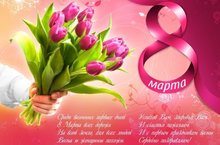 Поздравляем с 8 Марта! Желаем весеннего настроения, пусть на душе всегда будет светло и радостно. Желаю, чтобы на лице всегда сияла улыбка, пусть жизнь будет щедра на подарки. В самый женский день года желаем простого женского счастья и здоровья. С праздником!